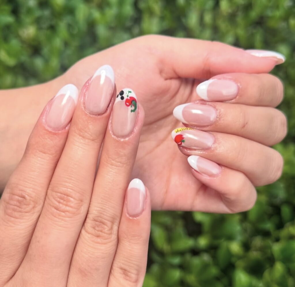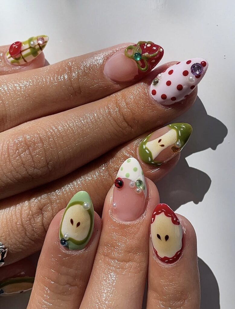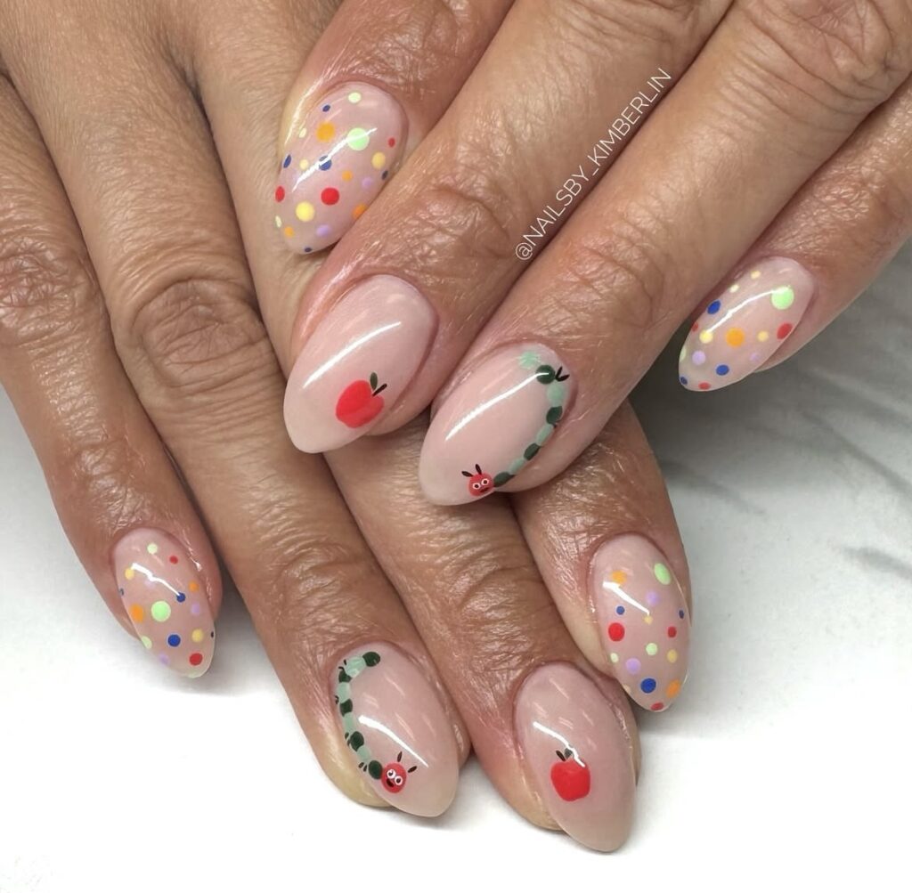 Playful and fresh – tiny apples, a little caterpillar, and colorful dotted details on a soft nude base make these nails feel straight out of a storybook! 🔴⚪️🔵🟢🟣🟠🟡🍎🐛
