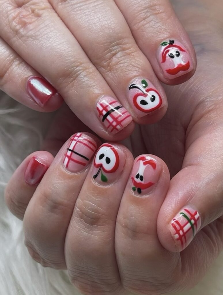 Bite me! Red nails with apple cores and cozy plaid accents